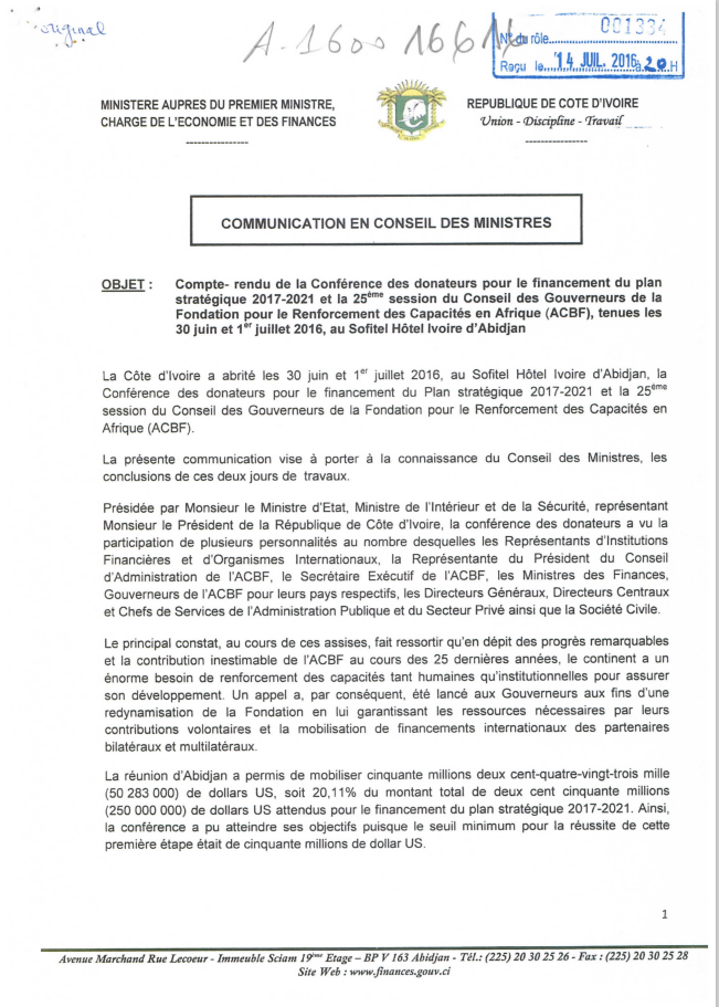 Compte- rendu de la Conférence des donateurs pour le financement du plan stratégique 2017-2021 et la 25eme session du Conseil des Gouverneurs de la Fondation pour le Renforcement des Capacités en Afrique (ACBF), tenues les 30 juin et 1er juillet 2016