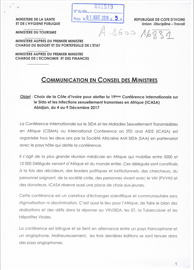Choix de la Côte d’ivoire pour abriter la 19ème Conférence Internationale sur le Sida et les Infections sexuellement transmises en Afrique (ICASA) Abidjan, du 4 au 9 Décembre 2017