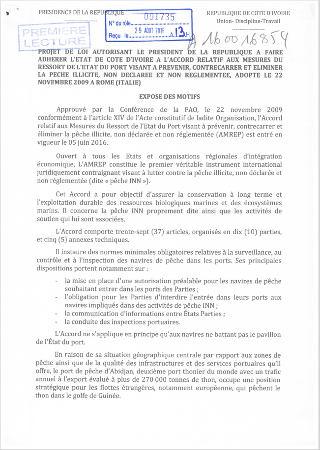 PROJET DE LOI AUTORISANT LE PRESIDENT REPUBLIQUE A FAIRE ADHERER L’ETAT DE COTE D’IVOIRE A L'ACCORD RELATIF AUX MESURES DU RESSORT DE L’ETAT DU PORT VISANT A PREVENIR, CONTRECARRER ET ELIMINER LA PECHE ILLICITE, NON DECLAREE ET NON REGLEMENTEE