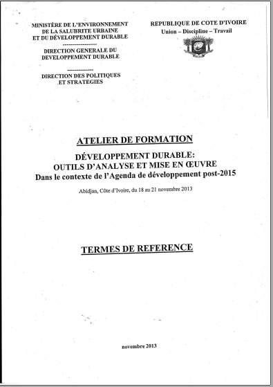 ATELIER DE FORMATION DÉVELOPPEMENT DURABLE : OUTILS D'ANALYSE ET MISE EN ŒUVRE Dans le contexte de l'Agenda de développement post-2015
