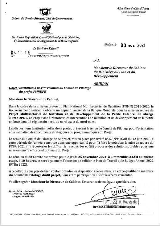 Invitation a la 4eme réunion du comité de pilotage du projet PMNDPE