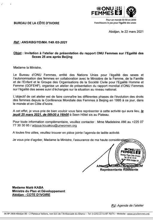 Invitation à l'atelier de présentation du rapport ONU Femmes sur l'Egalité des Sexes 25 ans après Beijing