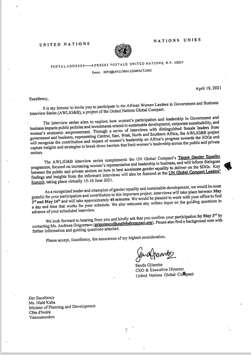 Projet du Pacte mondial des Nations Unies : invitation à participer à la Série d'entretiens avec les femmes africaines dirigeantes au sein des gouvernements et des entreprises (AWLIG&B).