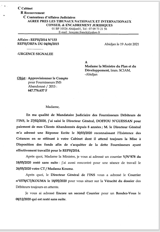 Approvisionner le Compte pour Fournisseurs INS Abandonné / 2015: 647.776.637 F