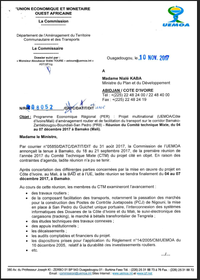 PER : Projet multinational (UEMOA/Côte d'Ivoire/Mali) d'aménagement routier et de facilitation du transport sur le corridor BamakoZantiébougou-Boundiali-San Pedro (PR8) - Réunion du Comité technique Mixte