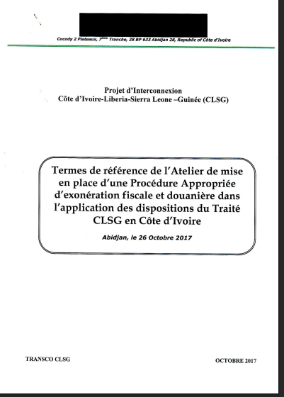 Projet d'Interconnexion Côte d'Ivoire-Liberia-Sierra Leone -Guinée (CLSG) : Termes de référence de l'Atelier de mise en place d'une Procédure Appropriée d'exonération fiscale et douanière dans l'application des dispositions du Traité CLSG en Côte d'Ivoire