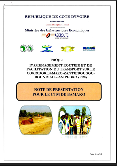 Projet d'aménagement routier et de facilitation du transport sur le corridor Bамако -Zantiebougou -Boundiali-San Pédro (PR8) : note de présentation pour le CMT de Bamako