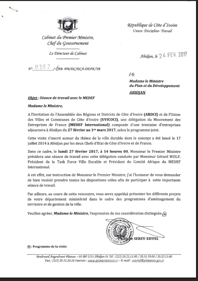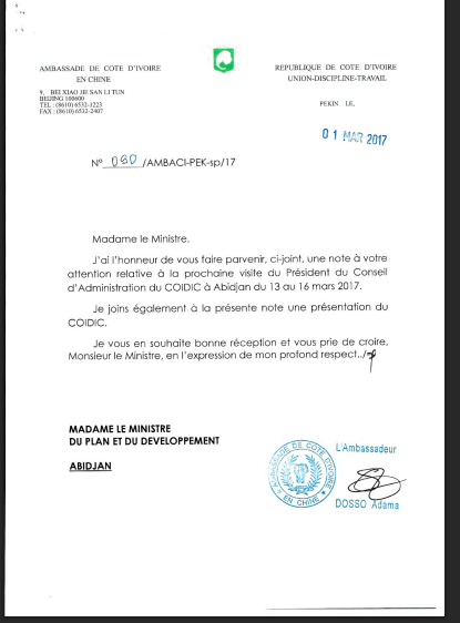 Note relative à la prochaine visite du Président du Conseil d'Administration du COIDIC à Abidjan du 13 au 16 mars 2017.
