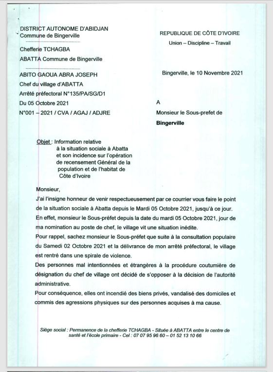 Information relative à la situation sociale à Abatta et son incidence sur l'opération de recensement Général de la population et de l'habitat de Côte d'lvoire