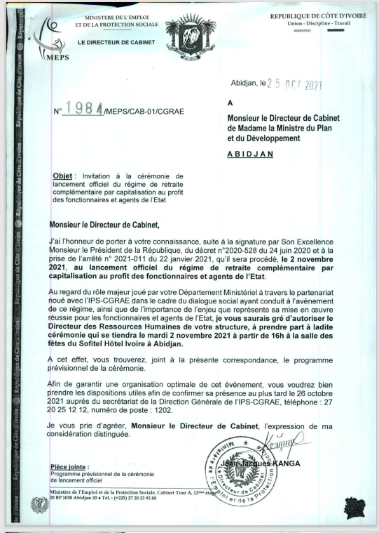 Invitation à la cérémonie de lancement officiel du régime de retraite complémentaire par capitalisation au profit des fonctionnaires et agents de l'Etat