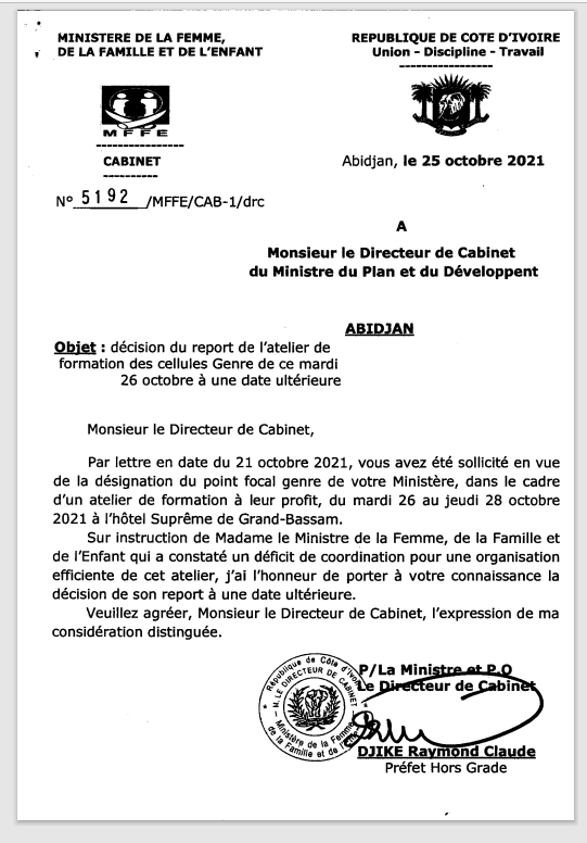 Décision du report de l'atelier de formation des cellules Genre du mardi 26 octobre 2021 à une date ultérieure