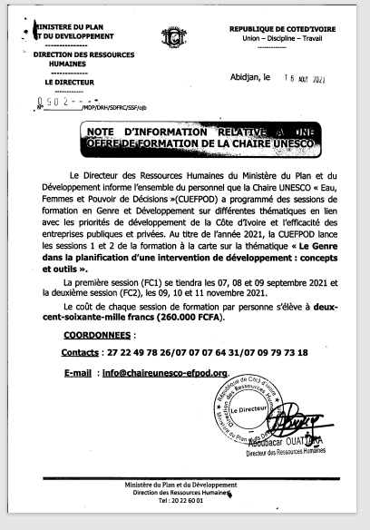 Note d'information relative à l'offre de formation de la chaire UNESCO pour les sessions 1 et 2 de la formation à la carte sur la thématique << Le Genre dans la planification d'une intervention de développement: concepts et outils ».