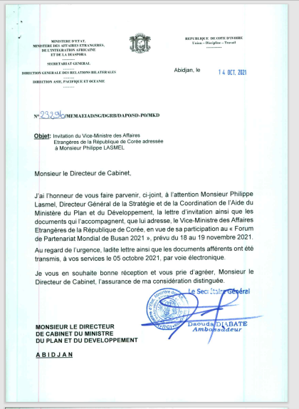 Invitation du Vice-Ministre des Affaires Etrangères de la République de Corée adressée à Monsieur Philippe LASMEL
