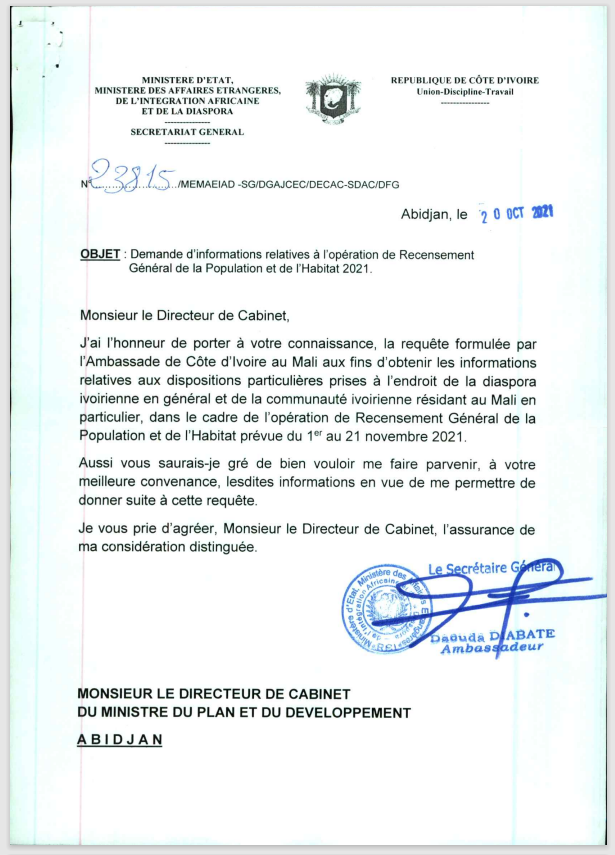 Demande d'informations relatives à l'opération de Recensement Général de la Population et de l'Habitat 2021.