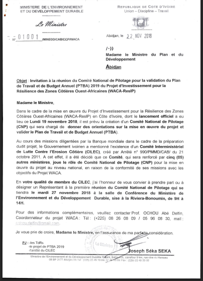 Invitation à la réunion du Comité National de Pilotage pour la validation du Plan de Travail et de Budget Annuel (PTBA) 2019 du Projet d'Investissement pour la Résilience des Zones Côtières Ouest - Africaines (WACA-ResIP)