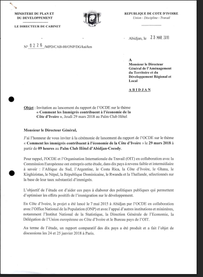 Invitation au lancement du rapport de l'OCDE sur le thème <<<Comment les Immigrés contribuent à l'économie de la Côte d'Ivoire », Jeudi 29 mars 2018 au Palm Club Hôtel