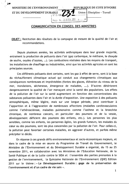 Communication en conseil des ministres relative à la Restitution des résultats de la campagne de mesure de la qualité de l'air et recommandations.