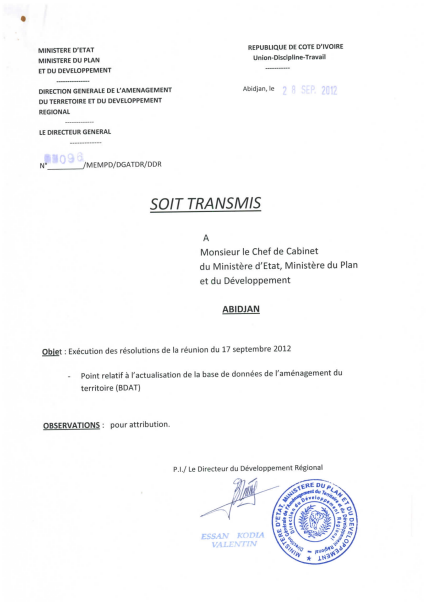 Courrier relatif au séminaire gouvernemental tenu le jeudi 03 mai 2012 à la salle des Pas Perdus du Palais Présidentiel,