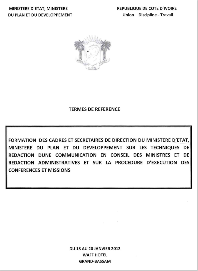 Termes de référence de la formation des cadres et secrétaires de direction du ministère d'Etat, Ministère du plan et du Développement sur les techniques de rédaction d'une communication en conseil des ministres