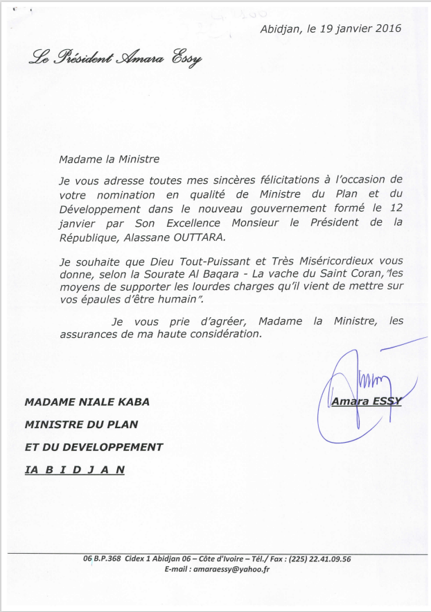 Courrier des félicitations relatives à la reconduction de Madame NIALE KABA en qualité de Ministre du Plan et du Développement.