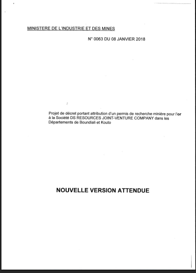 Projet de décret portant attribution d'un permis de recherche minière pour l'or à la Société DS RESOURCES JOINT-VENTURE COMPANY dans les Départements de Boundiali et Kouto