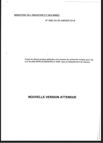Projet de décret portant attribution d'un permis de recherche minière pour l'or à la Société MARLIN MENERALS SARL dans le Département de Vavoua