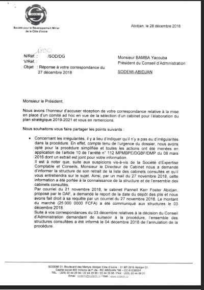 Réponse à la correspondance du 27 décembre 2018 relative à la mise en place d'un comité ad hoc en vue de la sélection d'un cabinet pour l'élaboration du plan stratégique 2019-2021