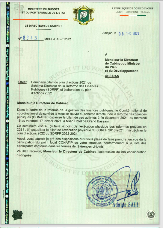 Séminaire bilan du plan d'actions 2021 du schéma Directeur de la réforme des finances publiques (SDRFP) et élaboration du plan d'actions 2022
