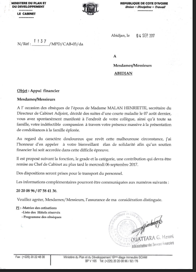 Demande d'appui financier de à l' occasion des obsèques de l'époux de Madame MALAN HENRIETTE, secrétaire du Directeur de Cabinet Adjoint