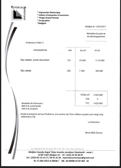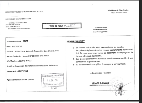 Fiche de rejet N°050 relatif à l'acquisition de matériels informatiques de bureau pour le compte Etude Nationale Prospective Cote d'Ivoire 2040.