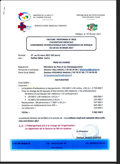 Facture proforma n°0025 couverture médicale Conférence Internationale sur l'Emergence en Afrique du 28 au 30 mars 2017