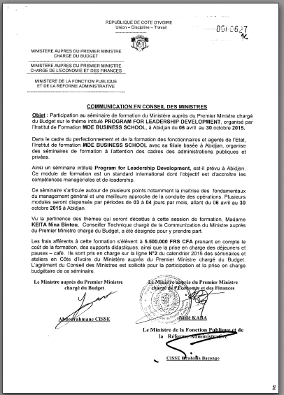 Communication en conseil des Ministres : Participation au séminaire de formation du Ministère auprès du Premier Ministre chargé du Budget sur le thème intitulé PROGRAM FOR LEADERSHIP DEVELOPMENT,