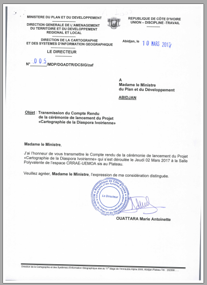 Transmission du compte rendu de la cérémonie de lancement du projet cartographie de la diaspora ivoirienne