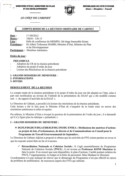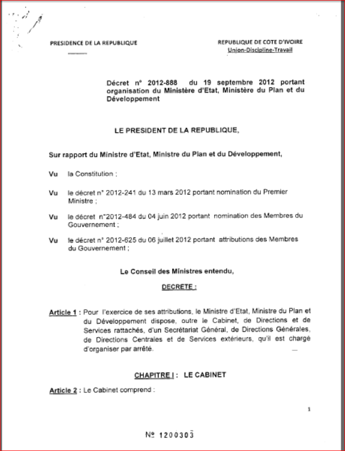 Décret n° 2012-888 du 19 septembre 2012 portant organisation du Ministère d’Etat, Ministère du Plan et du Développement