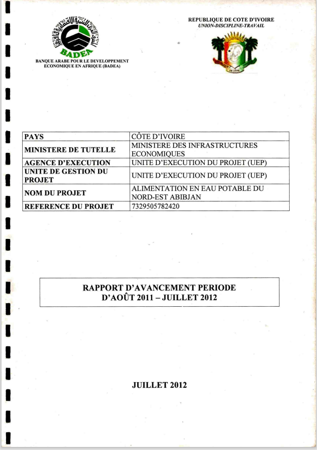 Rapport d’avancement du projet d’alimentation en eau potable du nord-est Abidjan période d’août 2011 - juillet 2012