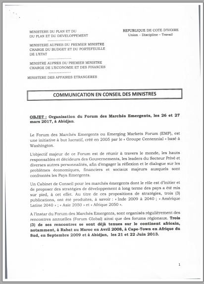 COMMUNICATION EN CONSEIL DES MINISTRES RELATIVE A L'ORGANISATION DU FORUM DES MARCHES EMERGENTS