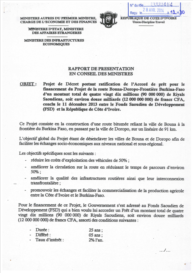Rapport du Projet de Décret portant ratification de l’Accord de prêt pour le financement du Projet de la route Bouna-Doropo-Frontière Burkina-Faso d’un montant total de 90 000 000 de Riyals Saoudiens conclu le 11 décembre 2013 entre le FDS et la CI