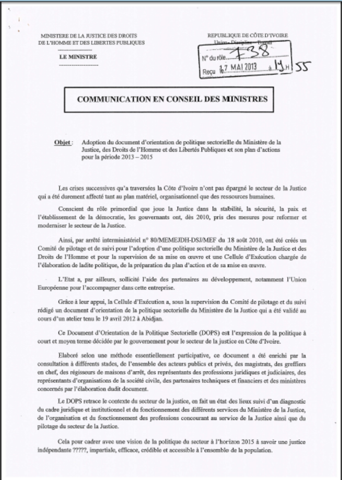 Communication en conseil des ministres-Adoption du document d'orientation de politique sectorielle du Ministère de la Justice, des Droits de l'Homme et des Libertés Publiques et son plan d'actions pour la période 2013-2015