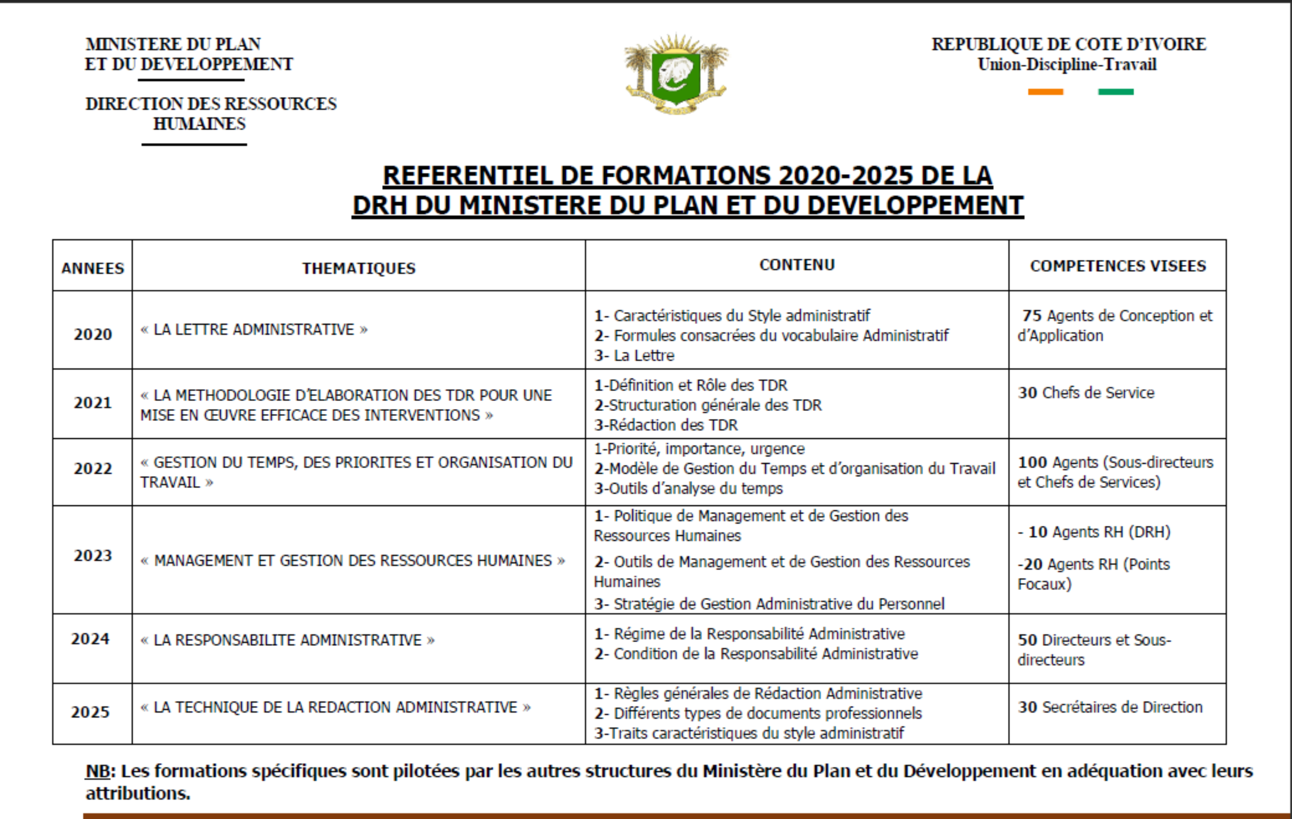 Référentiel de formations 2020-2025 de la DRH du Ministère du Plan et du Développement