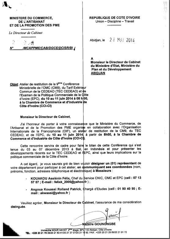 Atelier de restitution de la 9ème Conférence Ministérielle de l'OMC (CM9), du Tarif Extérieur Commun de la CEDEAO (TEC CEEAO) et l'Examen de la Politique Commerciale de la cote d'voire (EPC), du 10 au 11 Juin 2014 à 08 h